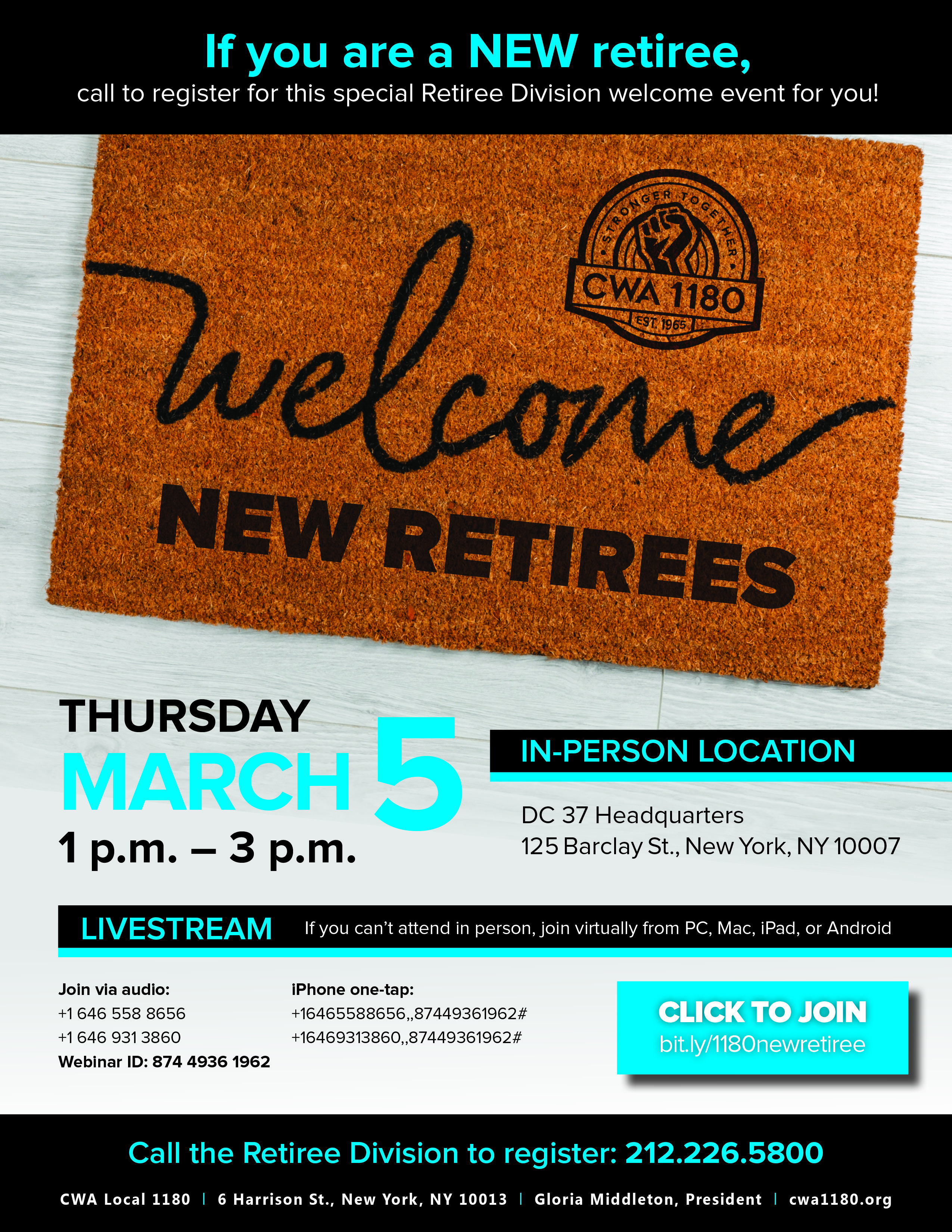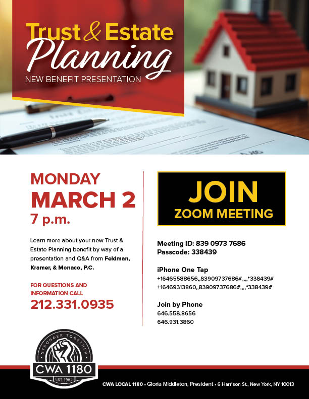 | Tues. 2/24 | IN-PERSON Review of Online Lessons / Q&A | 6 Harrison St. Call the Retiree Division to reserve your spot today: 212.226.5800 |