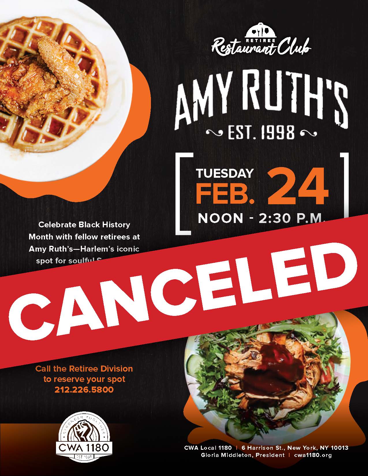 Restaurant Club - Amy Ruth's $45/person | Amy Ruth's Call the Retiree Division to reserve your spot today: 212.226.5800 | |