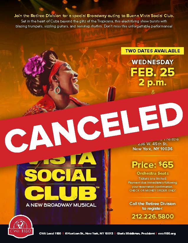 Buena Vista Social Club on Broadway $65/person | Gerald Schoenfeld Theatre Call the Retiree Division to reserve your spot today: 212.226.5800 | |